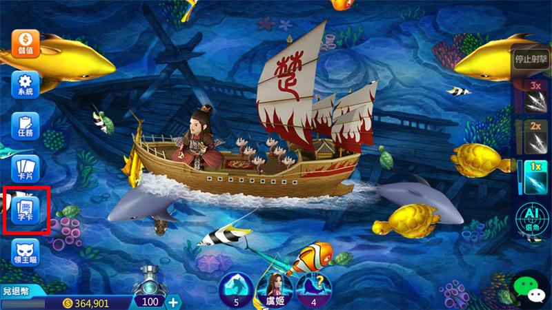於大眾區、貴賓區擊殺四星或以上魚種後,即有機會隨機獲得集字卡! 點擊「字卡」按鈕,可打開集字卡介面。