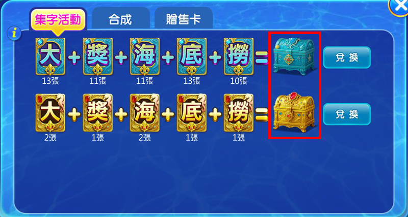集齊字卡後,可兌換相應的抽獎包,隨機獲得各種獎勵,包括金幣、捕魚道具、套裝、配件等,獎勵內容可點擊抽獎包(下圖紅框示)查看。