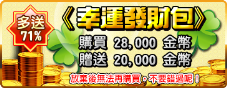 完成8項新手任務,即可使用優惠價購買『幸運發財包』,獲得48,000金幣乘勝出擊! |