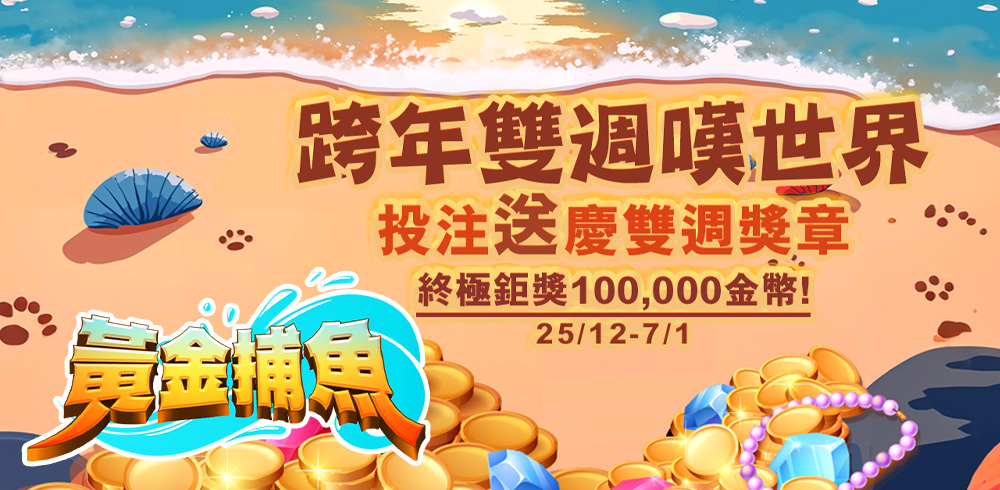 活動一詳情: 活動期間,於《黃金捕魚》每押注20萬金幣,即可獲得「黃金捕魚慶雙週獎章」,當累積達3枚「黃金捕魚慶雙週獎章」,即可兌換指定獎項: * 1:100區除外